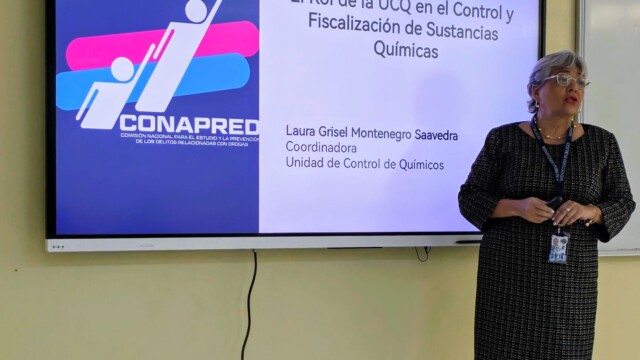 La Licda. Laura Montenegro, Coordinadora de la UCQ, expuso sobre el rol de la Unidad en el control y fiscalización de sustancias químicas controladas, destacando el marco legal y la importancia de prevenir su desvío hacia actividades ilícitas. Por su parte, el Lic. Fernando Vergara, químico de la UCQ, abordó el manejo y almacenamiento seguro de precursores y sustancias químicas controladas y vigiladas, resaltando las buenas prácticas y el cumplimiento de la normativa vigente.