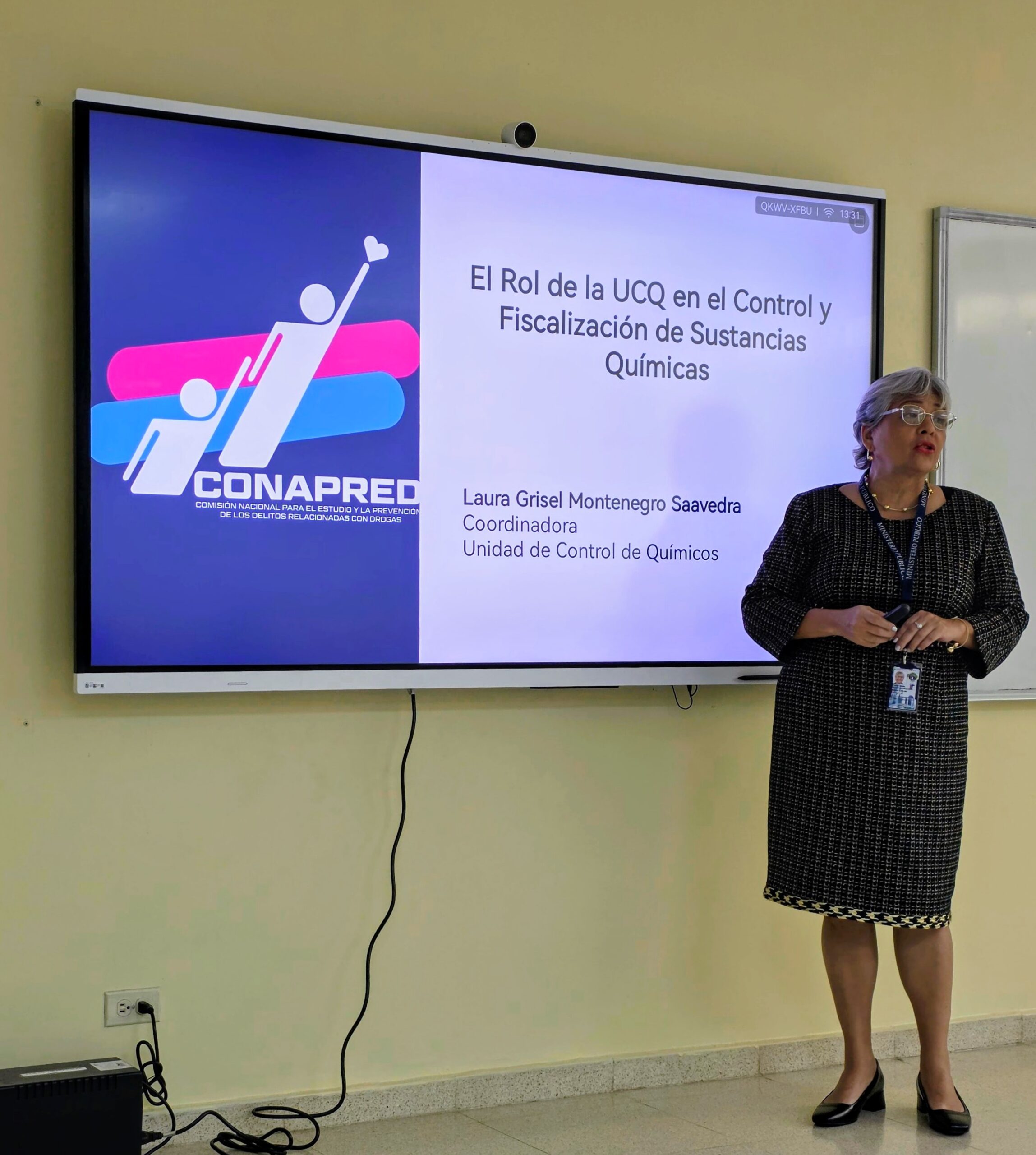 La Licda. Laura Montenegro, Coordinadora de la UCQ, expuso sobre el rol de la Unidad en el control y fiscalización de sustancias químicas controladas, destacando el marco legal y la importancia de prevenir su desvío hacia actividades ilícitas. Por su parte, el Lic. Fernando Vergara, químico de la UCQ, abordó el manejo y almacenamiento seguro de precursores y sustancias químicas controladas y vigiladas, resaltando las buenas prácticas y el cumplimiento de la normativa vigente.